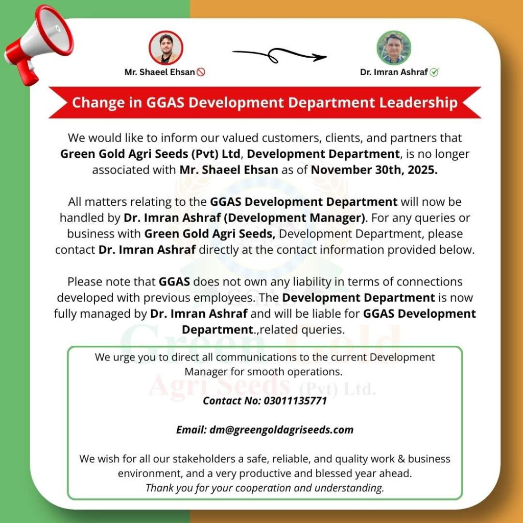 We would like to inform our valued customers, clients, and partners that Green Gold Agri Seeds (Pvt) Ltd, Development Department, is no longer associated with Mr. Shael Ehsan as of November 30th, 2025.